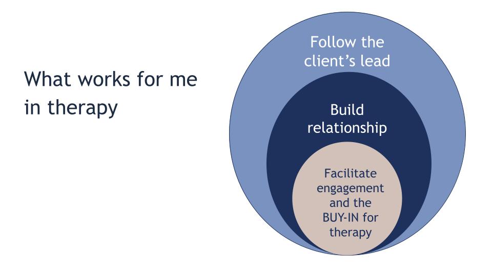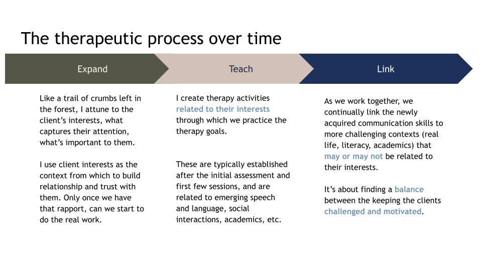 As time goes, we work to build that bridge between practicing new skills in highly motivating activities, to later using those skills, once solidified, in more challenging academic, social, or speaking situations, which may not always be fun. It’s hard work! But given a strong foundation of relationship and trust, the clients bravely make progress.